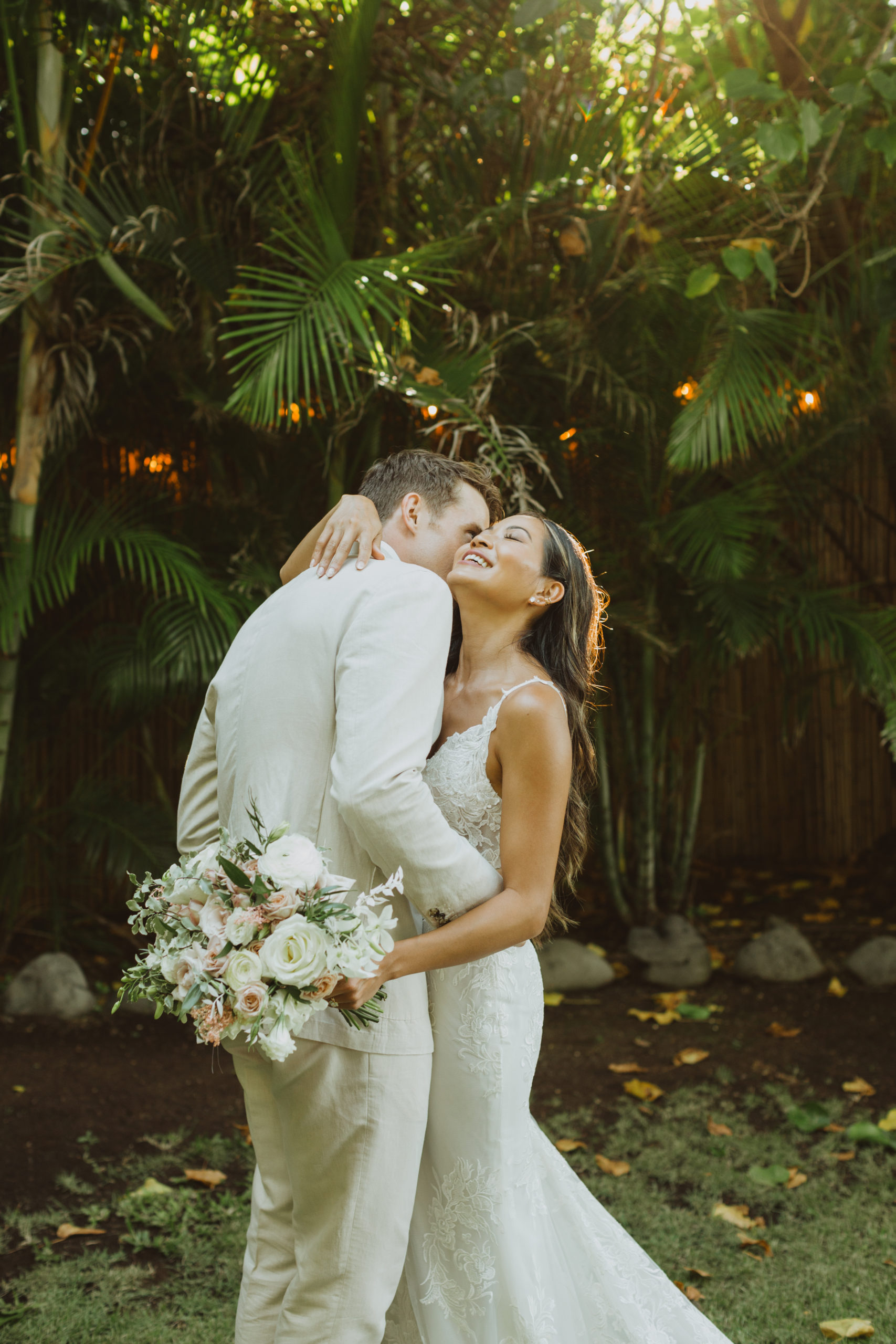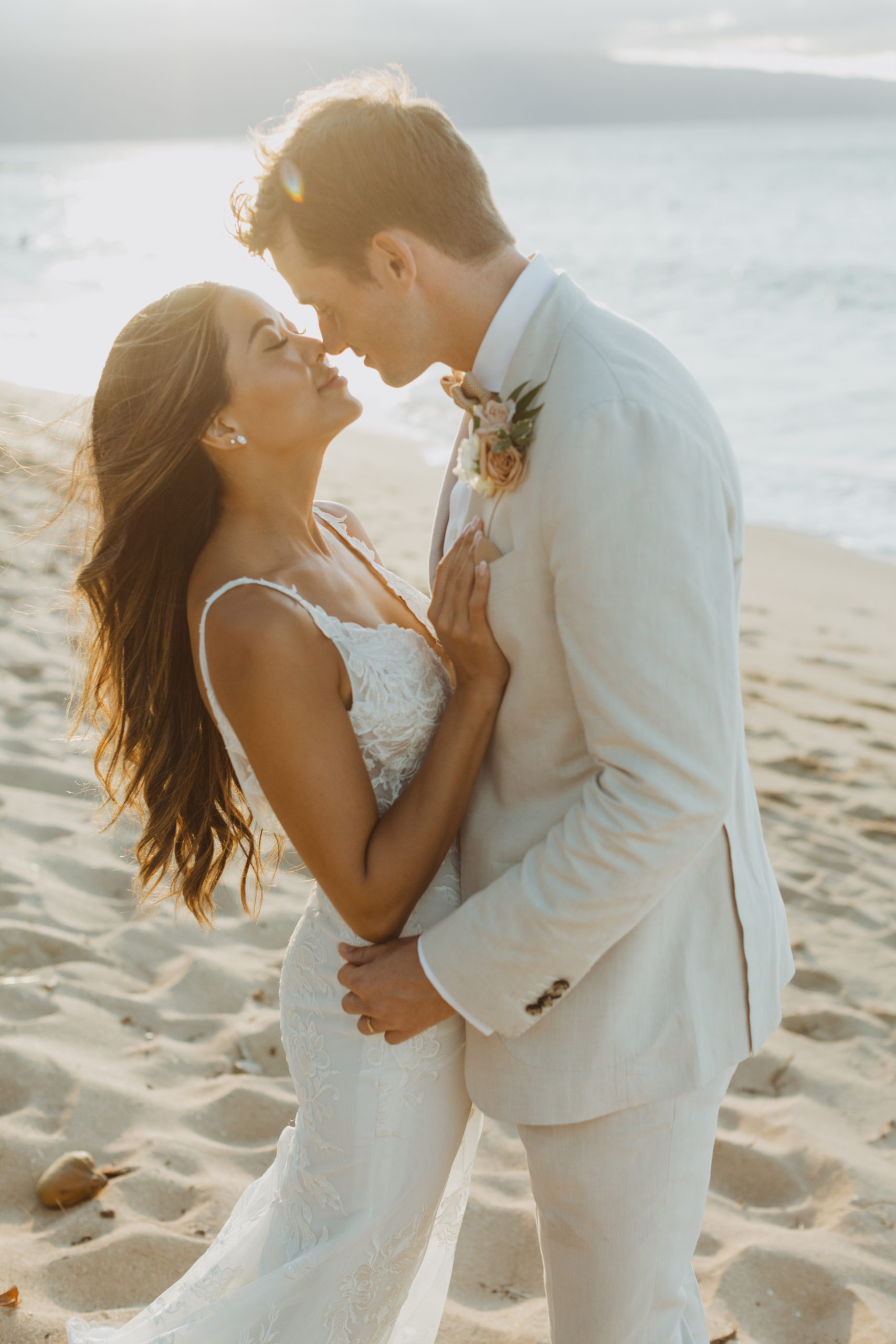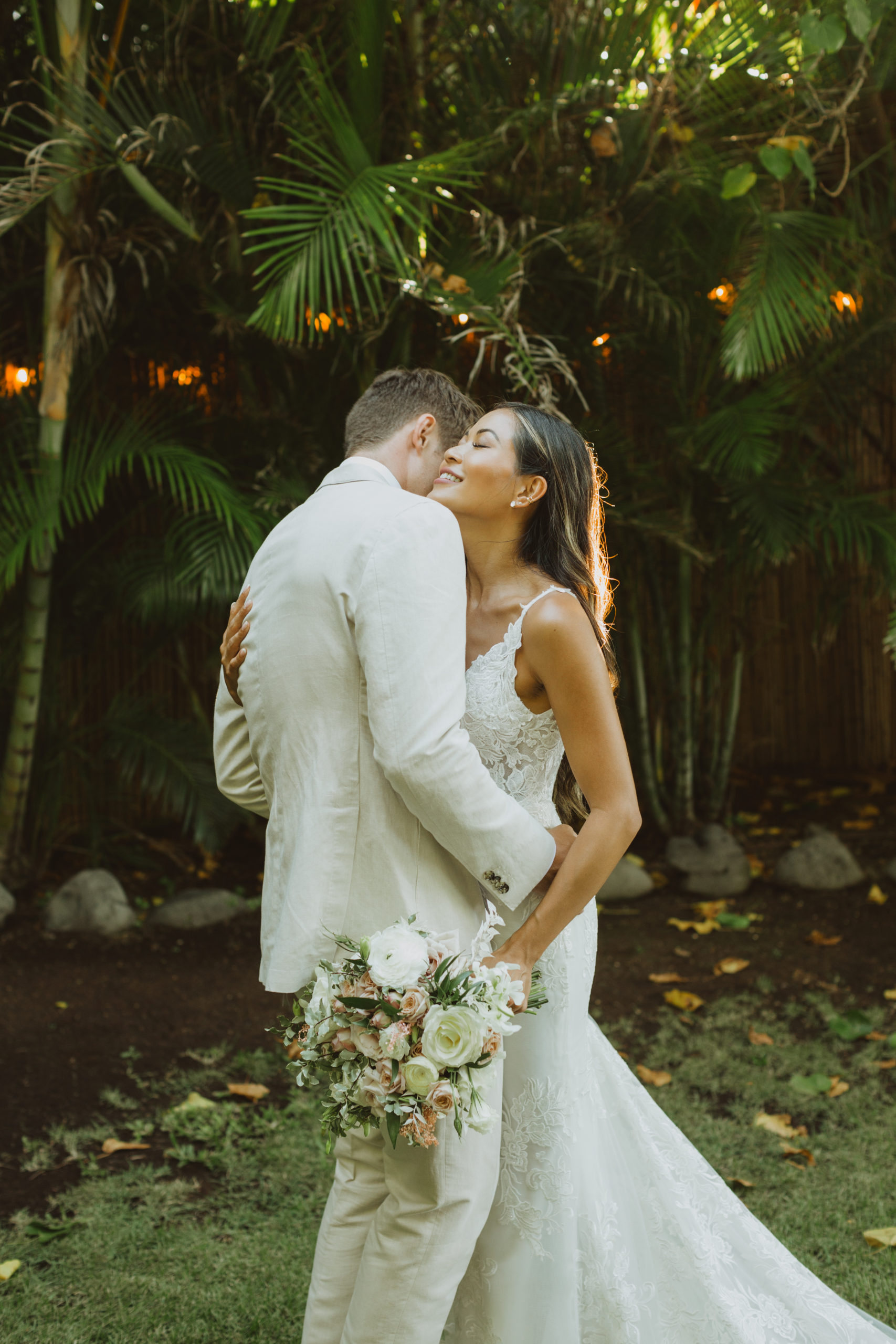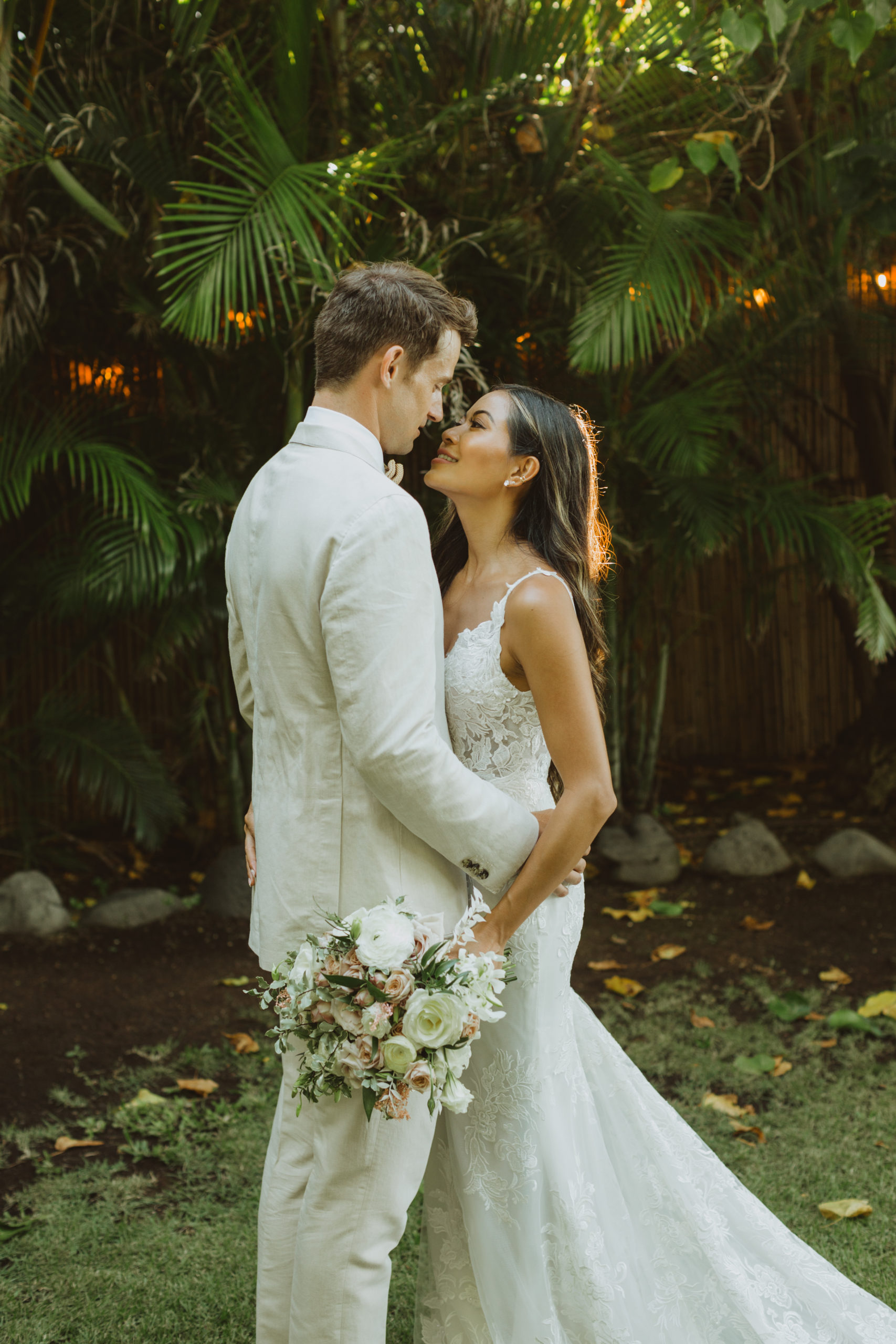 We captured their photos on the front lawn, with all the beautiful Hawaiian tropical greens and ended on the beach with that perfect Maui sunset for their wedding photos. It was pure magic to be apart of.