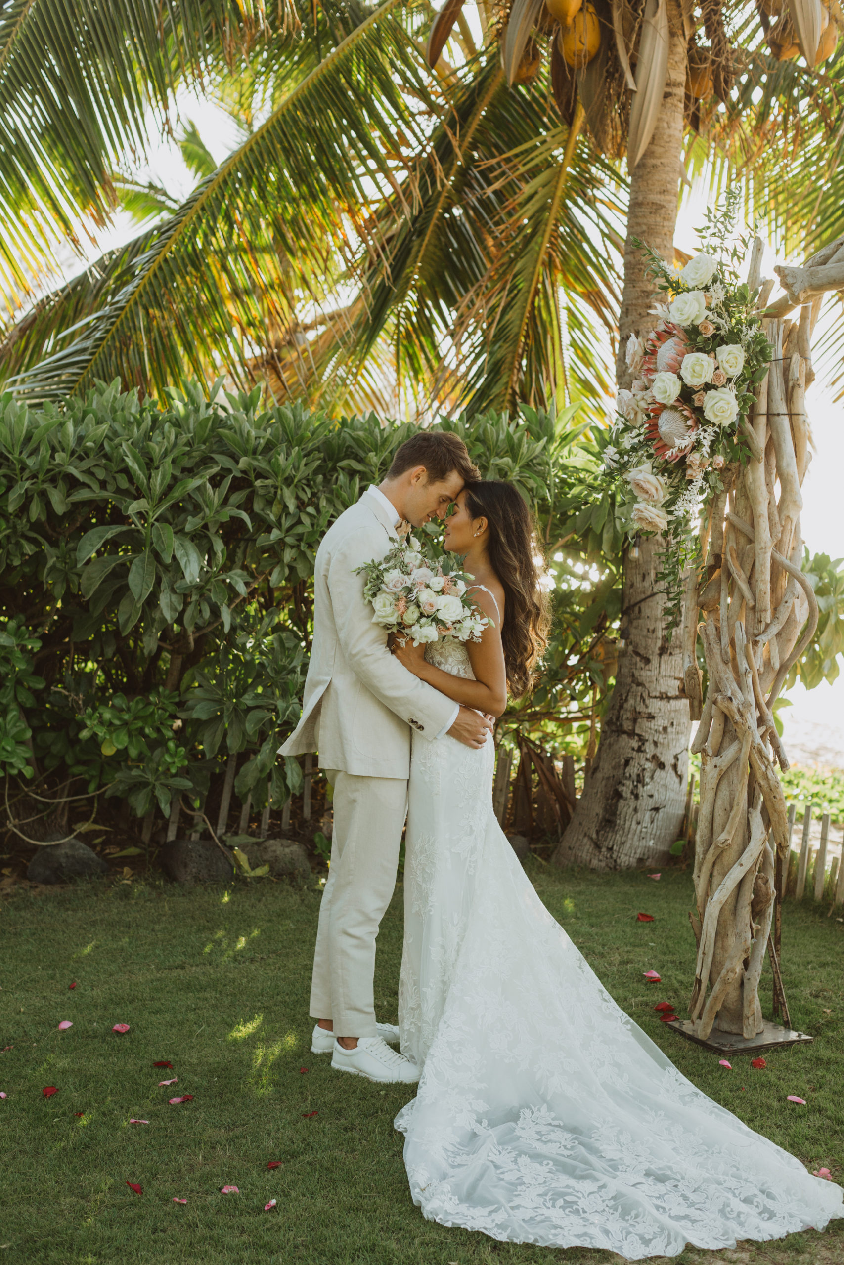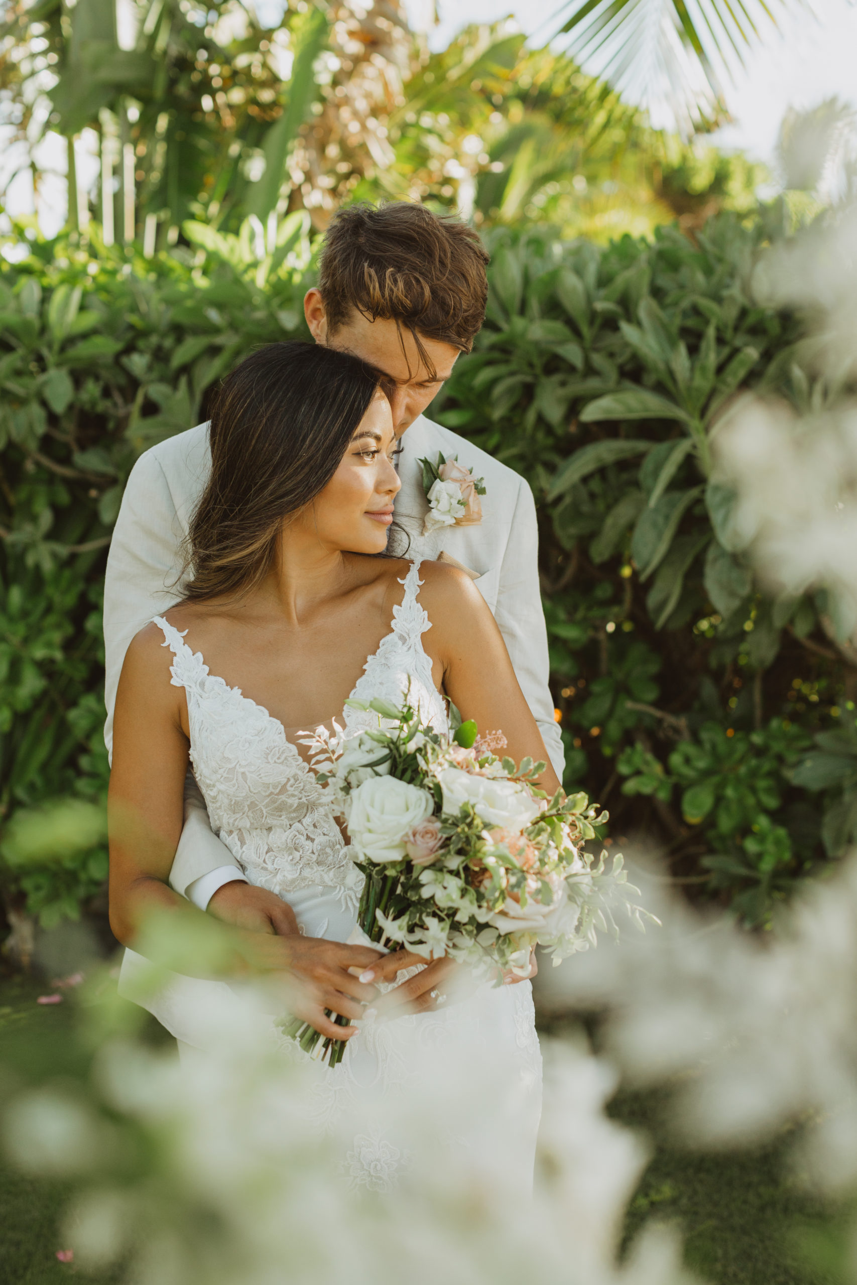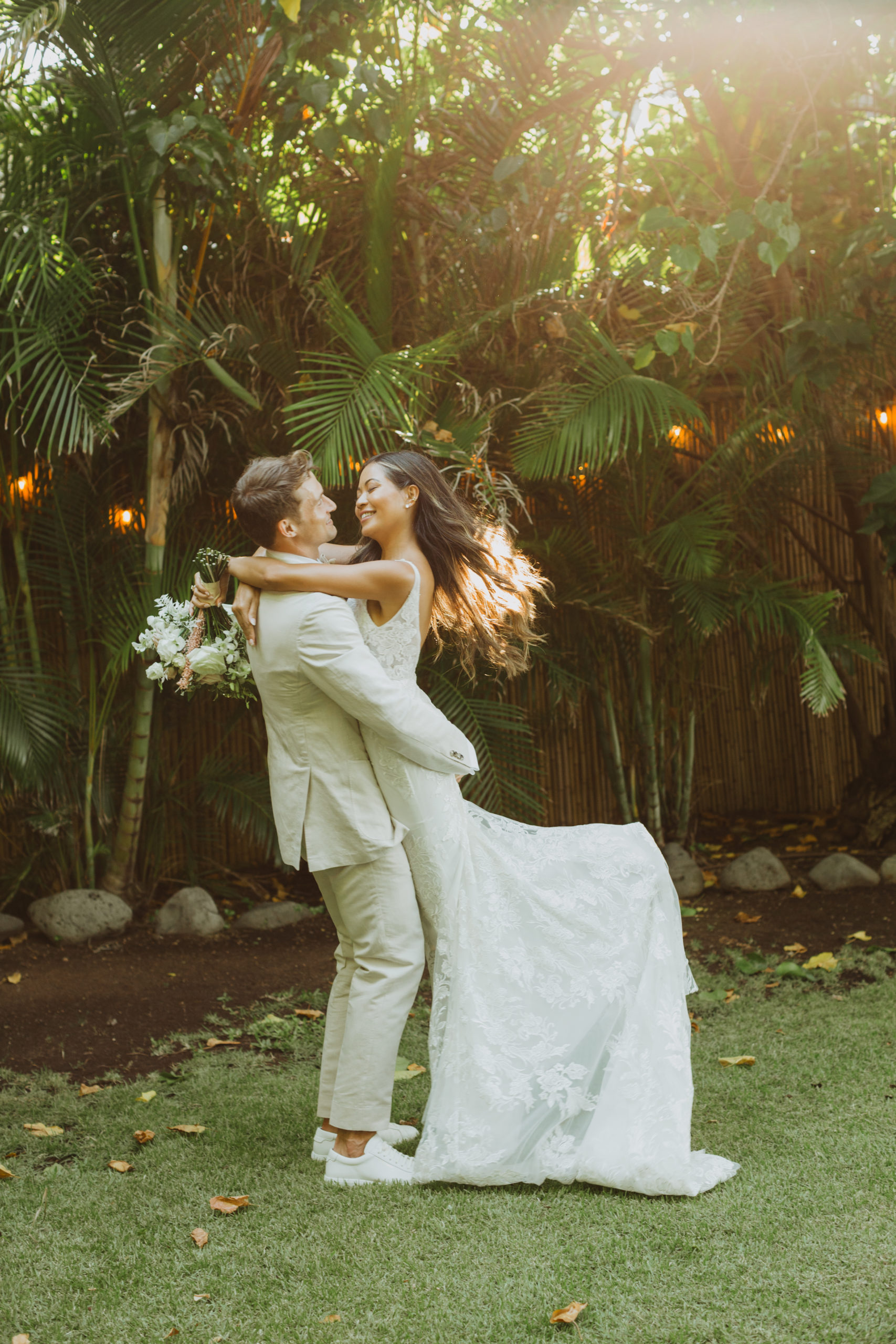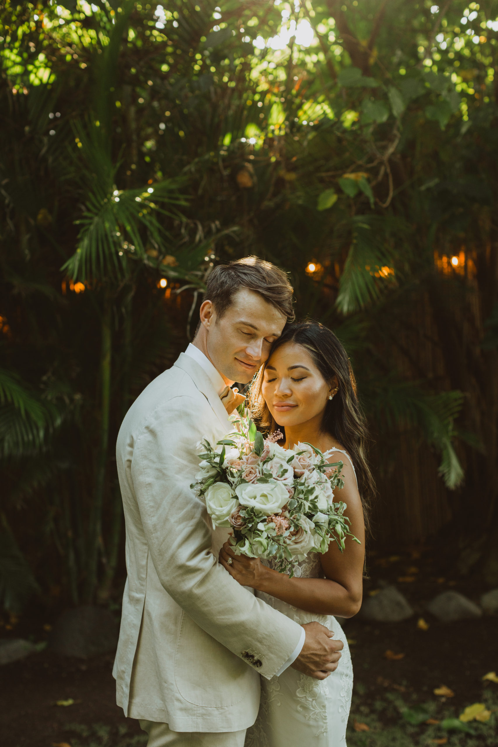 We captured their photos on the front lawn, with all the beautiful Hawaiian tropical greens and ended on the beach with that perfect Maui sunset for their wedding photos. It was pure magic to be apart of.